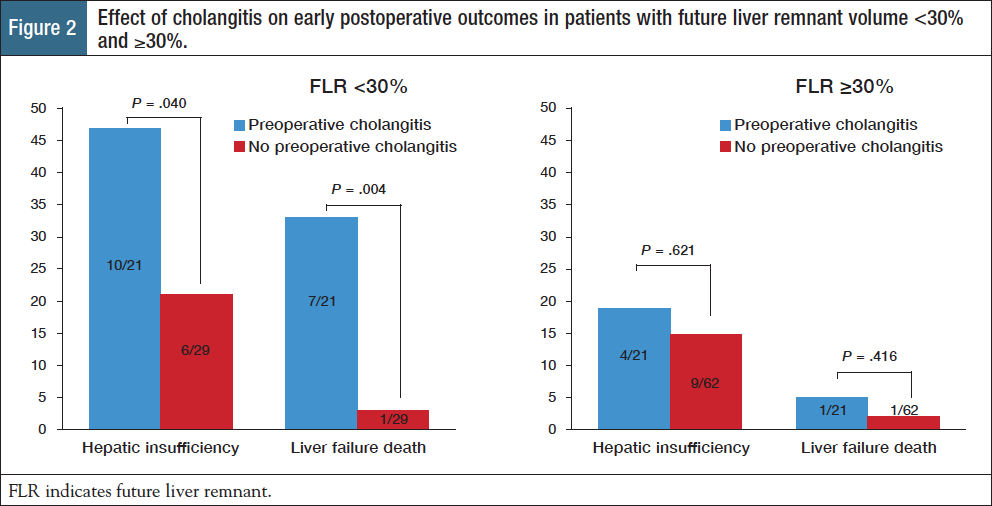A study showed that among patients with perihilar CCA who underwent liver resection, an FLR volume of <30% predicted higher rates of postoperative mortality compared with higher FLR volumes. Complete preoperative biliary drainage improved 90-day mortality in patients with intermediate (30%-50%) FLR volume compared with those with incomplete drainage. In contrast, no postoperative mortality was observed in undrained patients with FLR volumes of >50%.15 A separate study showed that preoperative cholangitis in the setting of an FLR volume of <30% increased the risk for hepatic insufficiency, liver failure, and death compared with no preoperative cholangitis (Figure 2).16