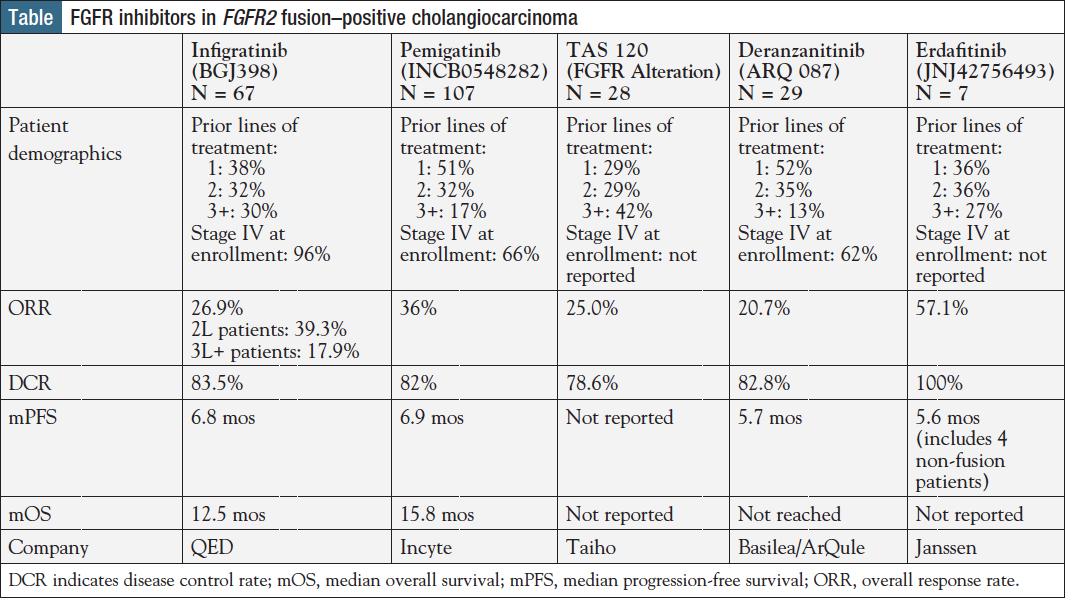 In clinical trials, patients with CCA containing FGFR2 fusions had superior response rates to FGFR inhibitors than to chemotherapy in the second-line setting. A relatively small percentage of patients do not respond to FGFR inhibitors in the presence of FGFR fusions. The small-molecule tyrosine kinase inhibitors directed against FGFR fusions that are in development all induce a similar disease control rate (approximately 80%) with a similar progression-free survival (PFS) of approximately 6 months (Table).27-31 In patients with CCA who have received 1 prior line of chemotherapy, the response rate to FGFR inhibitors seems to be higher compared with patients who have received ≥2 prior lines of chemotherapy.27