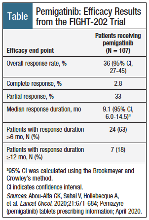 The FDA approval of pemigatinib was based on findings from the FIGHT-202 study, an open-label, single-arm, phase 2 clinical trial of 107 patients (median age, 56 years) with locally advanced unresectable or metastatic CCA associated with FGFR2 gene fusion or nonfusion rearrangement whose disease progressed with or after ≥1 previous therapies.4,5