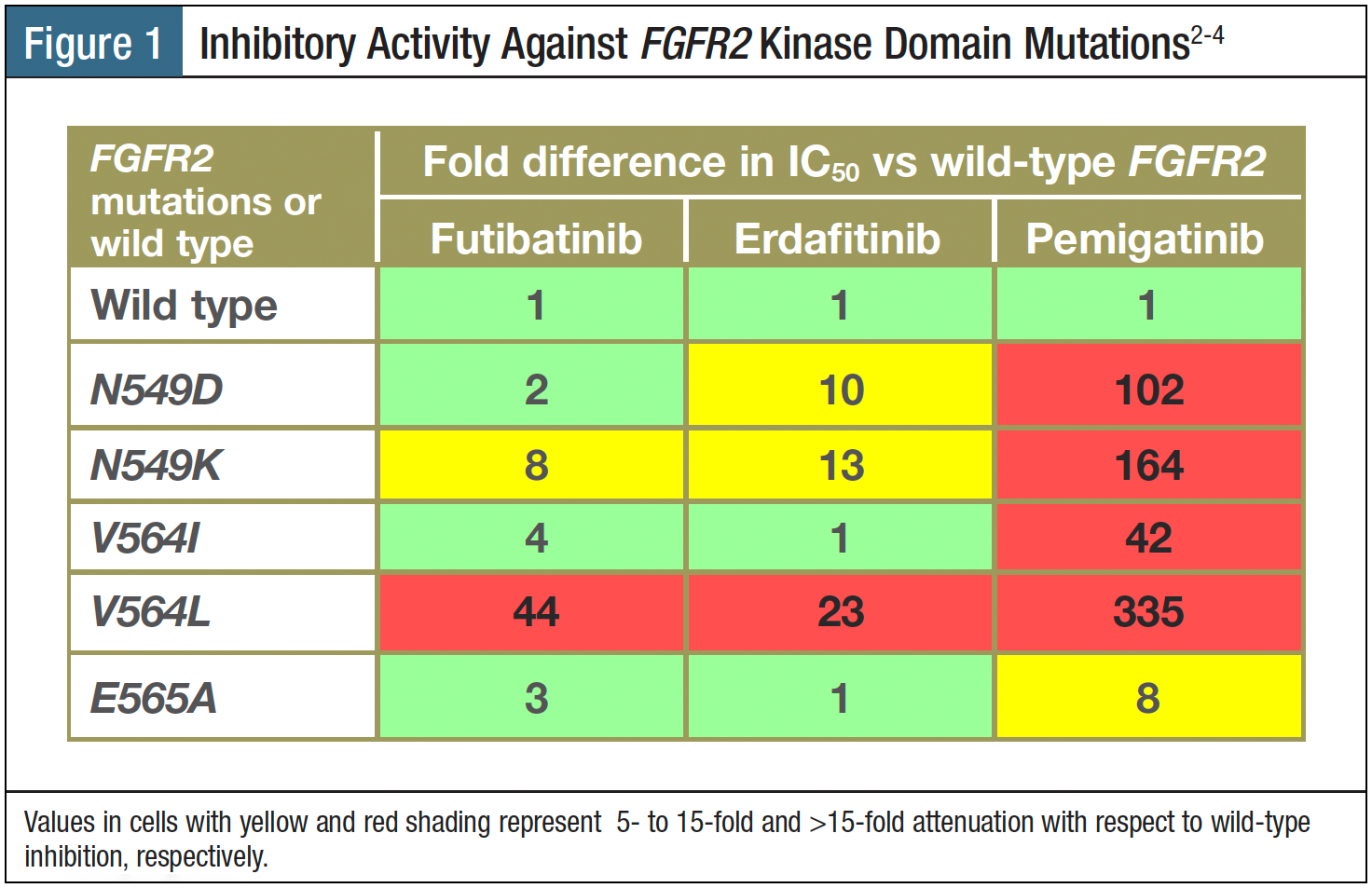 In contrast to other FGFR inhibitors, futibatinib demonstrates covalent, irreversible binding to an FGFR kinase domain P-loop,2 and robust inhibition of the FGFR2 kinase domain mutations that are resistant to reversible ATP-competitive inhibitors (Figure 1).2-4