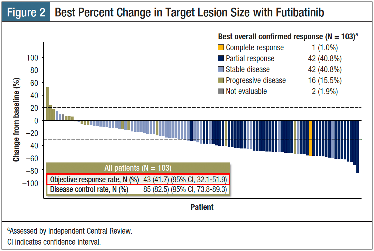 The study enrolled patients with unresectable or metastatic intrahepatic CCA with an FGFR fusion or other rearrangement, who had received previous gemcitabine plus platinum–based chemotherapy but no previous FGFR inhibitor.1 Patients received futibatinib 20 mg orally once daily, continuously over 21-day cycles, until disease progression, drug intolerance, withdrawal of consent, or death.