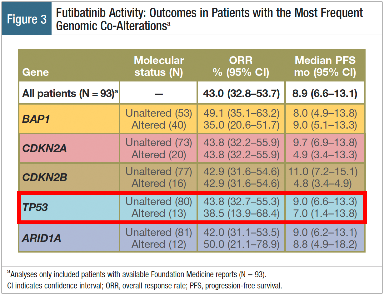 Exploratory analyses of molecular correlates showed that the responses occurred in patients with BICC1 as well as non-BICC1 fusion partners. Responses were also seen in patients with co-occurring genomic alterations in tumor suppressor genes, including in TP53 (Figure 3).