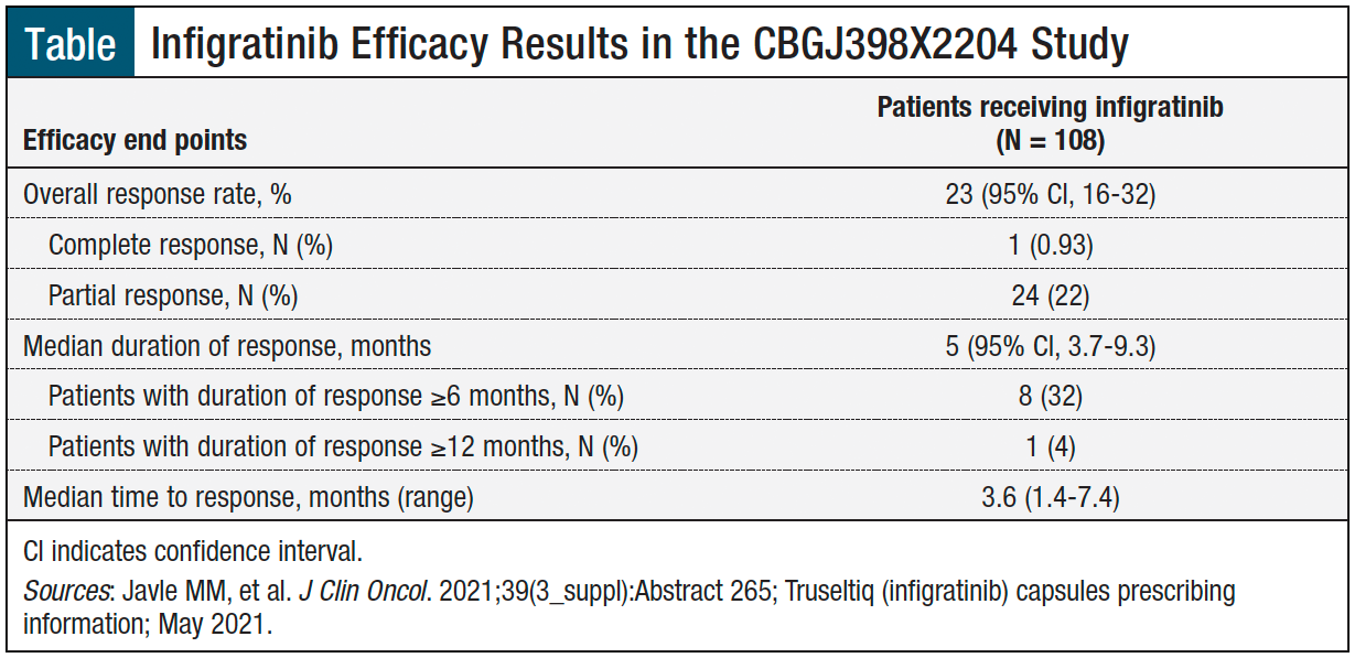 The overall response rate with infigratinib was 23%, which included 1 complete response and 24 partial responses (Table).7,11 The median duration of response was 5 months. Of patients who achieved a response, 8 (32%) patients maintained their treatment response for ≥6 months (Table).7,11