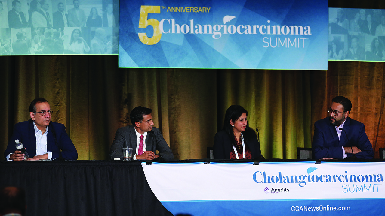 Panelists participating in Session V discussed new molecular targets and pathways in cholangiocarcinoma (CCA). Shubham Pant, MD, MBBS, began the session with a discussion of HER2 in biliary tract cancer (BTC). HER2 is an established therapeutic target in patients with breast and gastric cancer, and a number of novel HER2-targeted therapies are being evaluated in gastrointestinal malignancies.1 Given that HER2 amplification/overexpression is observed in a subset of BTCs, including resected BTC, investigators suspect that the role of HER2-directed therapies being studied in gastrointestinal cancers may extend to patients with BTC.1 The MyPathway trial evaluated the combination of anti-HER2 antibodies pertuzumab and trastuzumab in patients with HER2-positive metastatic BTC. In this trial, the overall response rate (ORR) was 29%, median progression-free survival (PFS) was 4 months, and overall survival (OS) was 10.9 months.2 In the phase 2b HERIZON-BTC-01 study, zanidatamab, a HER2-targeted bispecific antibody, demonstrated meaningful clinical benefit in patients with HER2-amplified BTC.3 The ORR was 41.3%, and the median PFS was 5.5 months, with a manageable safety profile.3 Dr Pant also discussed a multi-institutional phase 2 trial, the Korean Cancer Study Group HB19-14 study, which evaluated the clinical activity of trastuzumab plus gemcitabine/cisplatin combination therapy as initial treatment in patients with HER2-positive BTC.4 This treatment regimen resulted in a 12-month OS rate of 39.1% and median OS of 9.96 months.4 The 12-month PFS rate was 17.6%, and the median PFS was 7 months.4 Dr Pant concluded that these data support the continued development of HER2-targeted therapies as a future treatment option in patients with HER2-positive BTC.