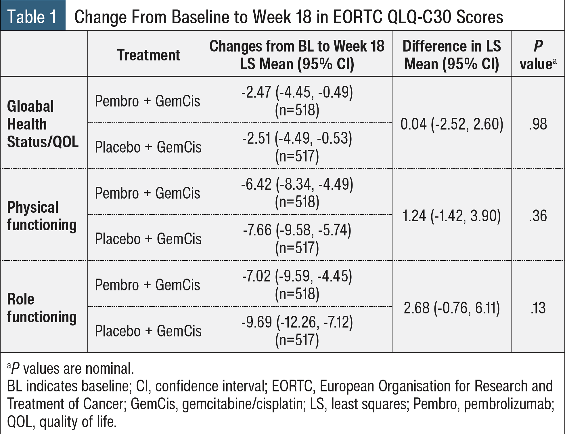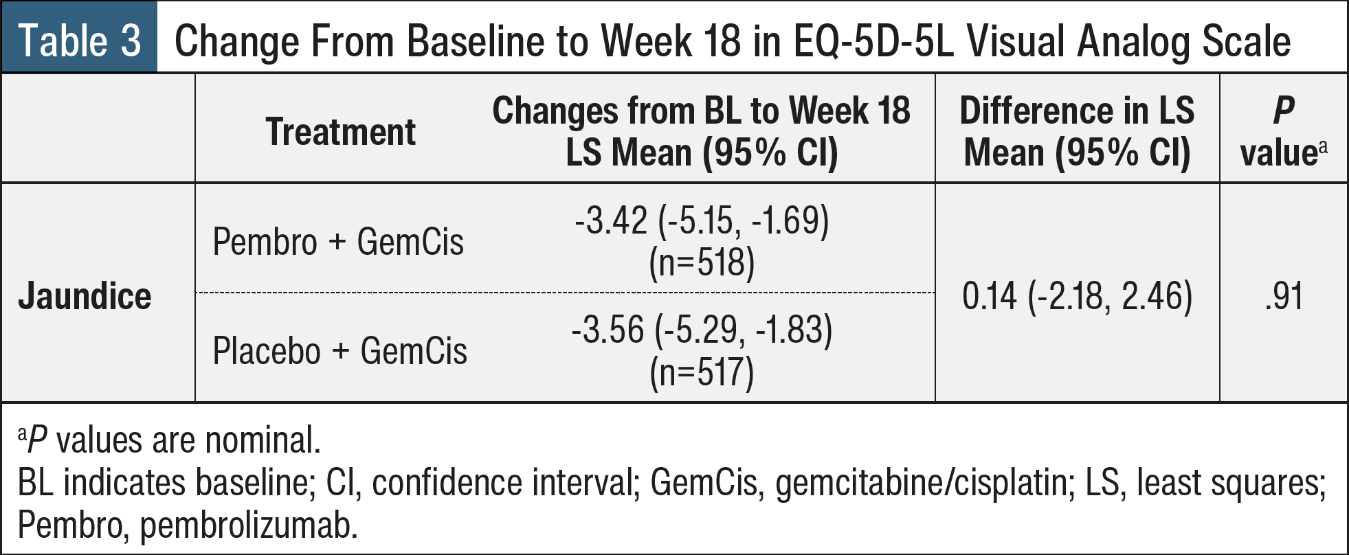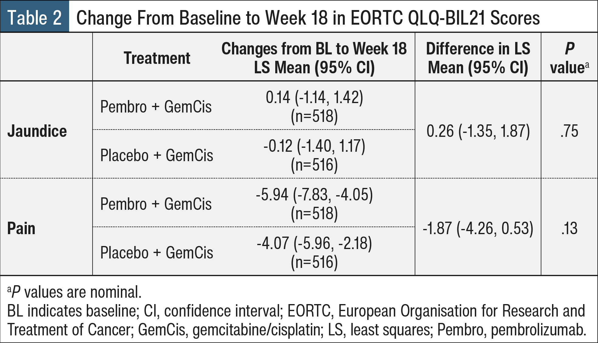 The analysis population included all treated patients who completed ≥1 HRQOL assessment for the specific end point. The primary end points were change from baseline (BL) to latest time point with ≥60% completion rate and ≥80% compliance rate for EORTC QLQ-C30, EORTC QLQ-BIL21 scores, and EQ-5D-5L VAS; and time to confirmed deterioration (TDDa) in EORTC QLQ-C30 GHS/QOL, PF, and RF domains and EORTC QLQ-BIL21 jaundice and pain domains.2 A constrained longitudinal analysis model was used to compare the least squares mean (LSM) score changes from BL to week 18.2 The questionnaire compliance rate was >87% from BL to week 18 in both treatment groups.2 The LSM changes from BL to week 18 for all 3 questionnaires were similar between both treatment groups (Tables 1-3).2 Similar changes were seen from BL to week 18 in EORTC QLQ-C30 GHS/QOL, PF, and RF; EORTC QLQ-BIL21 jaundice and pain; and EQ-5D-5L VAS between the 2 treatment groups.2 TDDa was also similar in both arms; no significant differences were found in TDDa in EORTC QLQ-C30 GHS/QOL, PF, or RF domains, or EORTC QLQ-BIL21 jaundice and pain domains.2