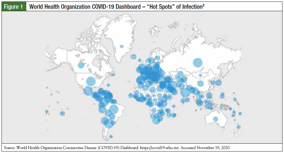 The first confirmed case in the United States of the 2019 novel coronavirus (COVID-19) was reported on January 21, 2020, and as of November 27, 2020, there were >63 million confirmed cases and >1.5 million deaths globally (Figure 1).1-3 Despite the global impact, certain populations have been identified as having a higher risk of developing severe COVID-19 infection, including patients with cancer.4 Various studies have shown that patients with cancer experience particularly poor outcomes after COVID-19 infection.5-11 As a result of the pandemic, care delivery has been disrupted to some degree based on the need for prioritization and limitations on resources. Therefore, healthcare providers and patients have been continually reassessing the balance between the benefits and risks of anticancer interventions in the context of the added risk of COVID-19 infection.12