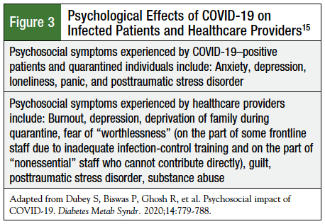 Findings from previous outbreaks show that the psychological impact of quarantine can range from immediate effects, such as fear and frustration, to extreme consequences, including suicide.18-22 Postquarantine effects include socioeconomic distress and psychological symptoms as a result of financial loss.18 The psychosocial impact of COVID-19 varies among different strata of society (Figure 3).15